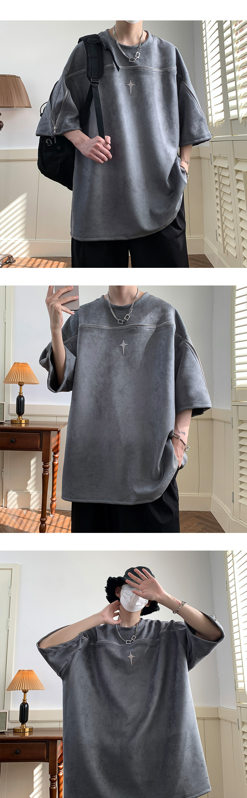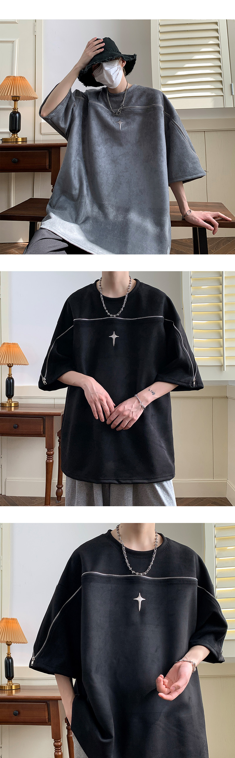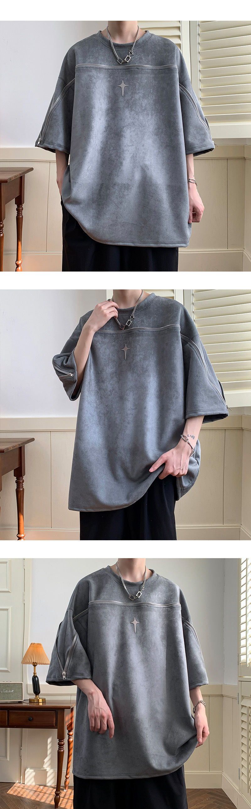 高品質 スエード ユニークなジッパーデザイン ファッション半袖シャツ