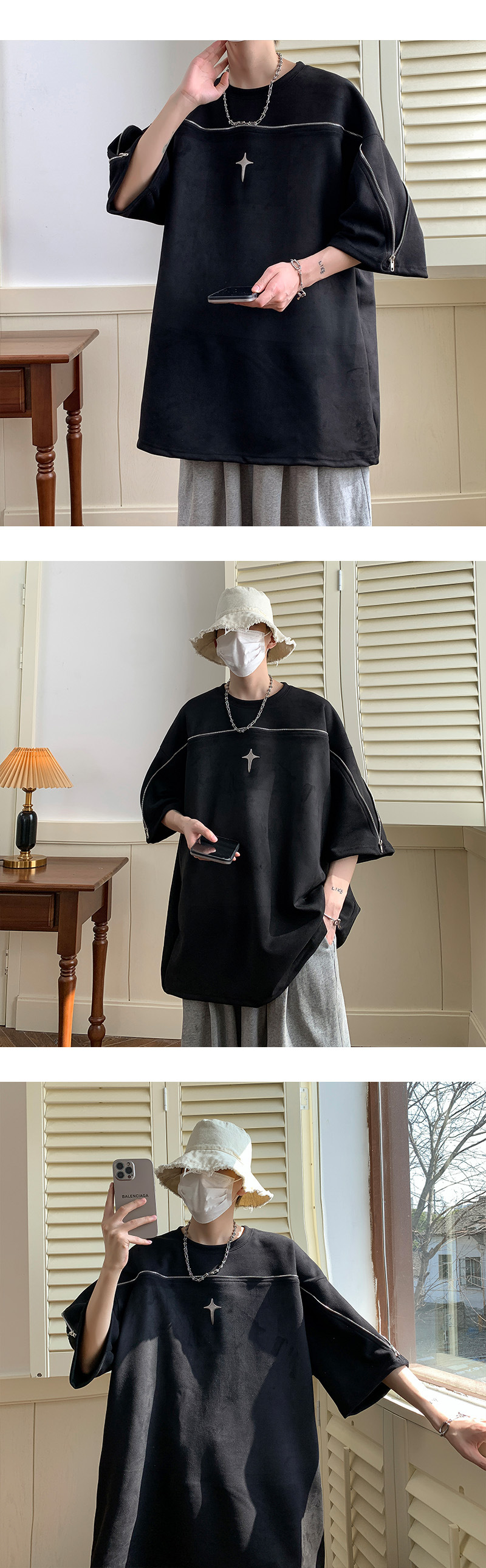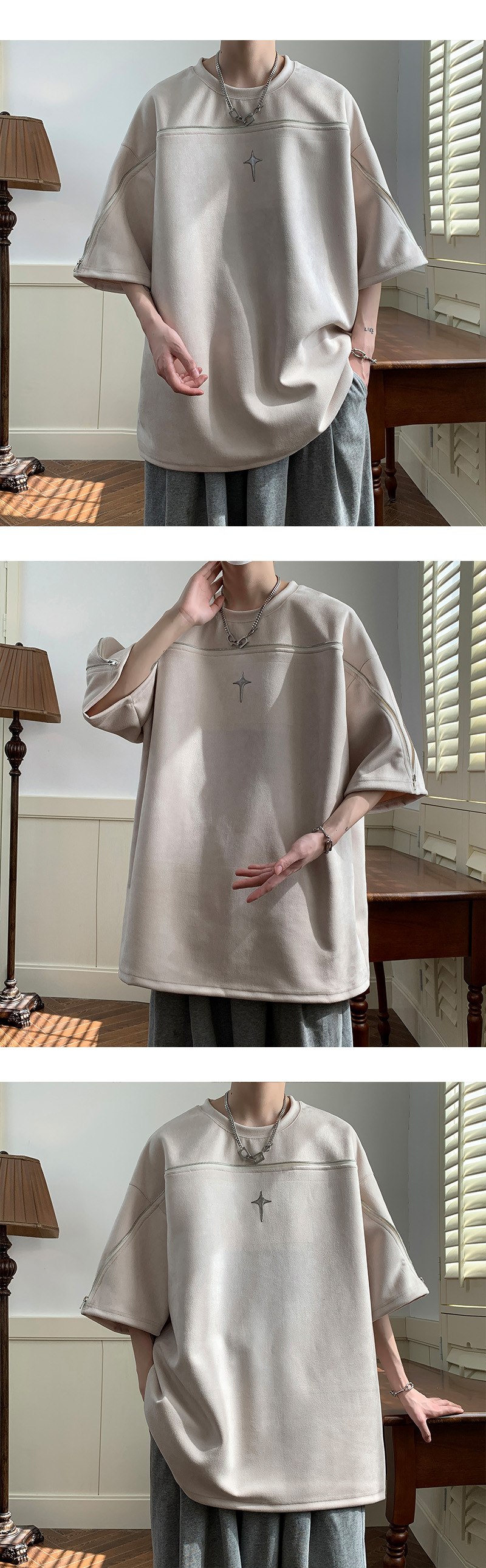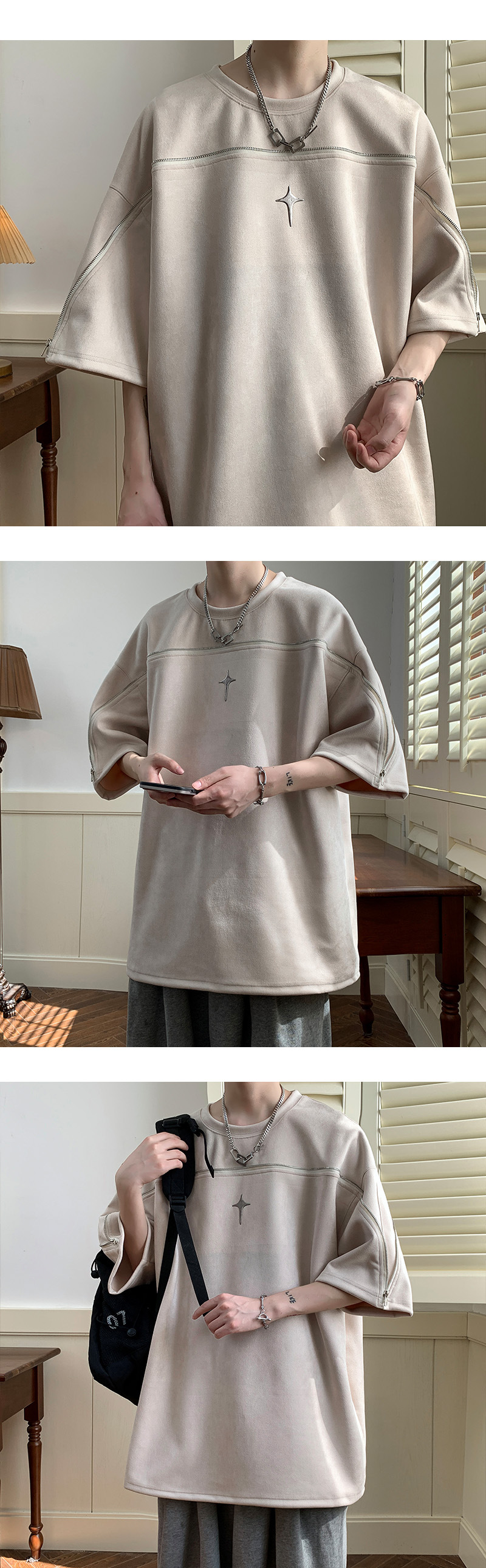 高品質 スエード ユニークなジッパーデザイン ファッション半袖シャツ